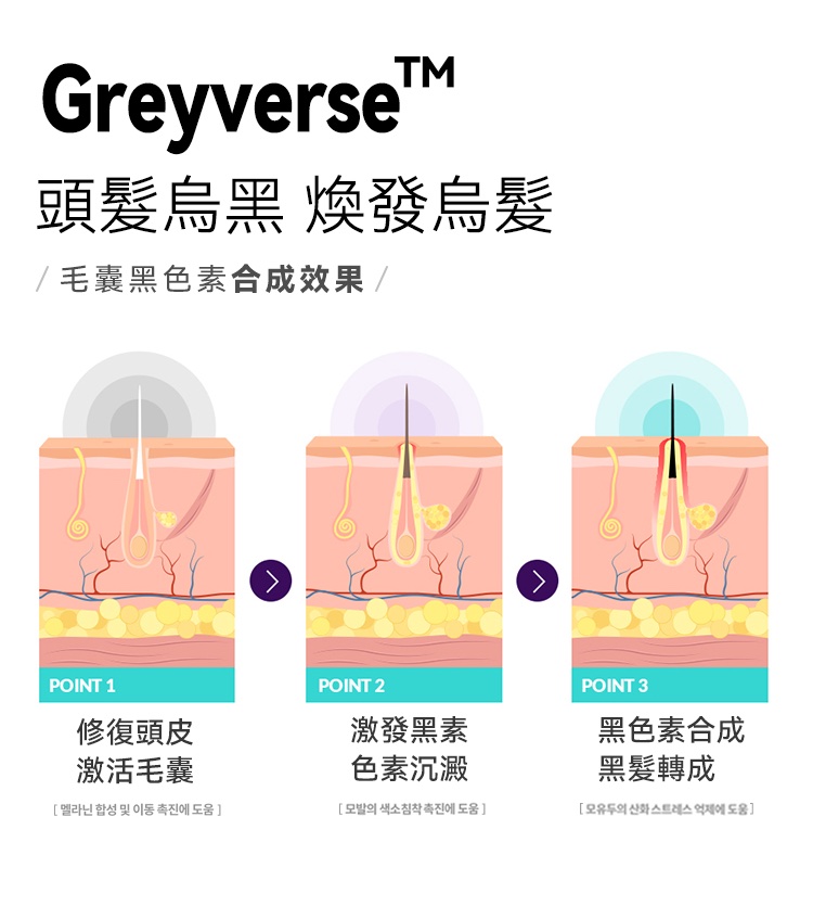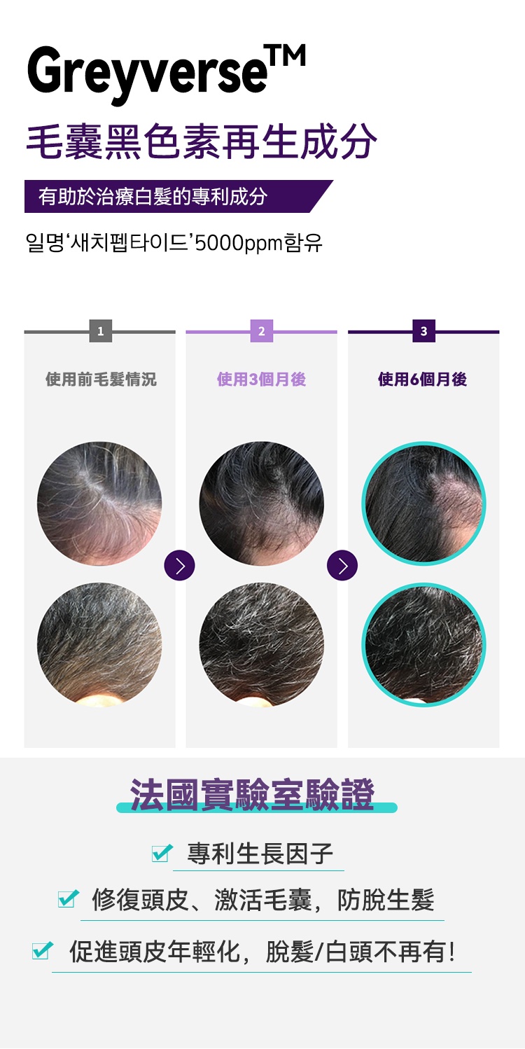 國際專利GREYVERSE、同時結合法國黑茶、黑米萃取精華等,有效刺激黑色素再生,減緩白髮生成