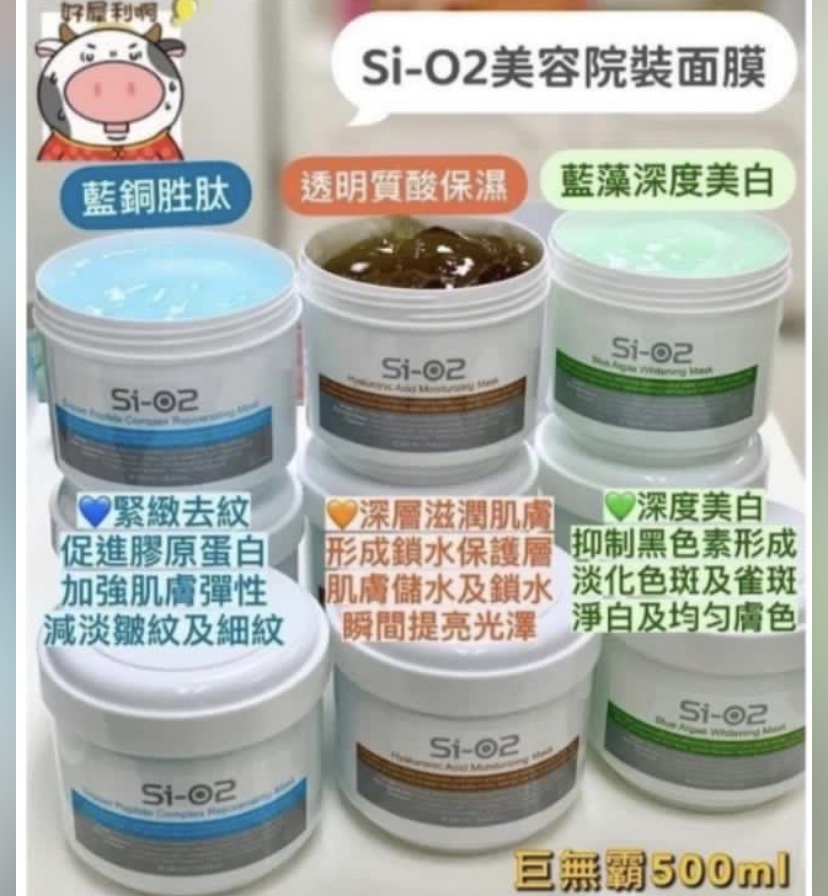| 種類 | Si-O2 #藍銅胜肽面膜, Si-O2 #透明質酸保濕面膜, Si-O2 #藍藻深度美白面膜, Si-O2 #益生菌水漾平衡面膜, SiaO2 #多元滋潤玫瑰面膜 |